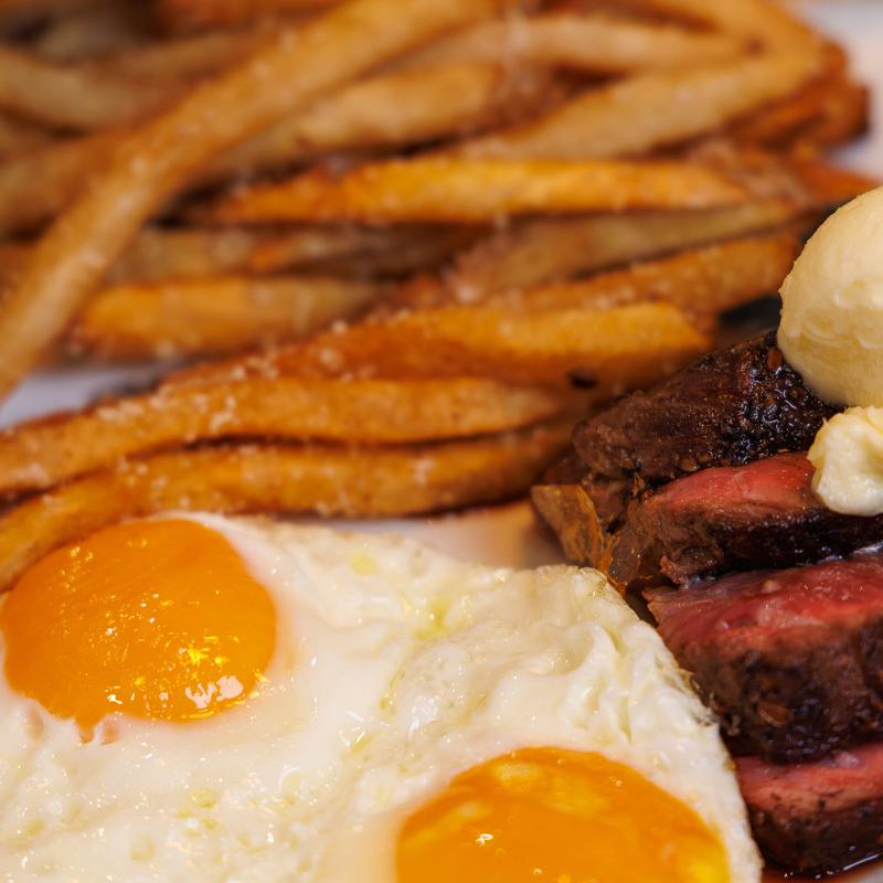 6oz marinated Denver steak served with herbed butter, two cage free eggs any style, hand cut Parmesan fries, choice of toast, hollandaise or house made steak sauce