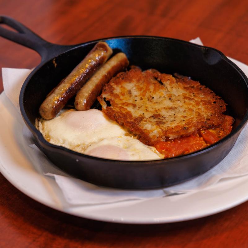 two eggs basted, hash browns, pork sausage links, exotic mushroom blend & roasted tomato, served in a cast iron skillet