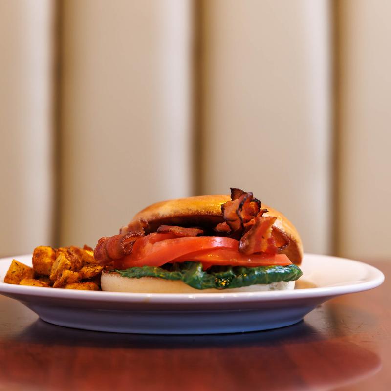 Bacon, lettuce, tomato on a bagel & house homestyle potatoes