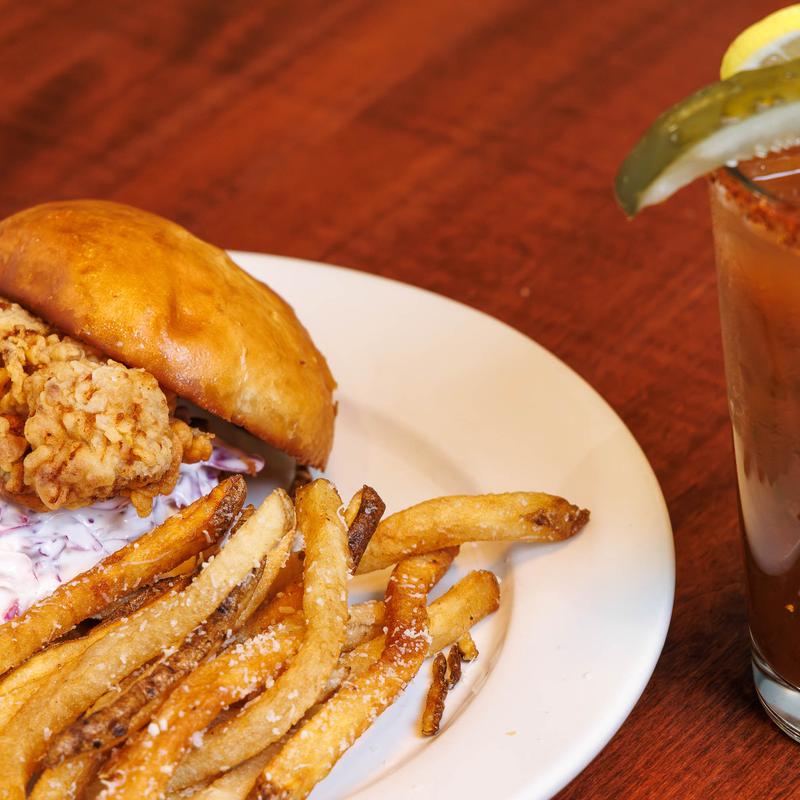 Cajun oil drizzled crispy fried chicken, mimosas secret sauce, dill pickle slices, over creamy coleslaw on a toasted brioche bun served with hand cut parm dusted french fries