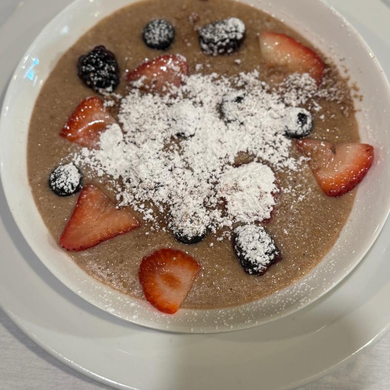 Steel-cut oats, stone ground grits, cinnamon, nutmeg, vanilla, almond milk, pecan sugar, mixed berries