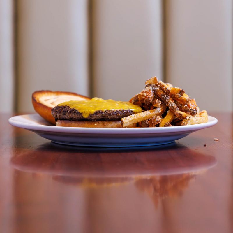 7 oz burger, cheddar cheese, all on a toasted brioche bun served with hand cut parm dusted french fries