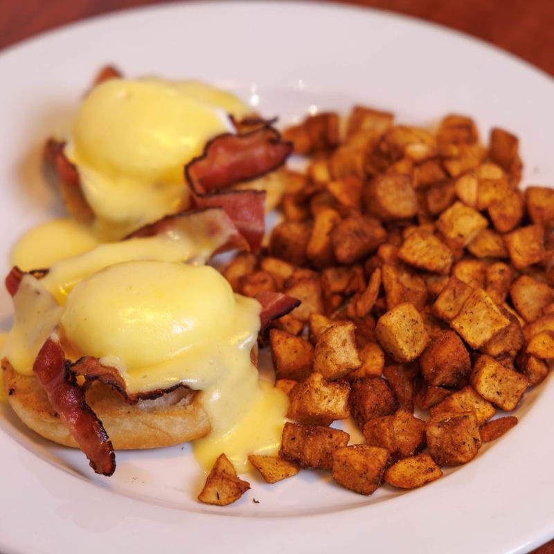Bacon, two cage free poached eggs, grilled english muffin and hollandaise, homestyle potatoes