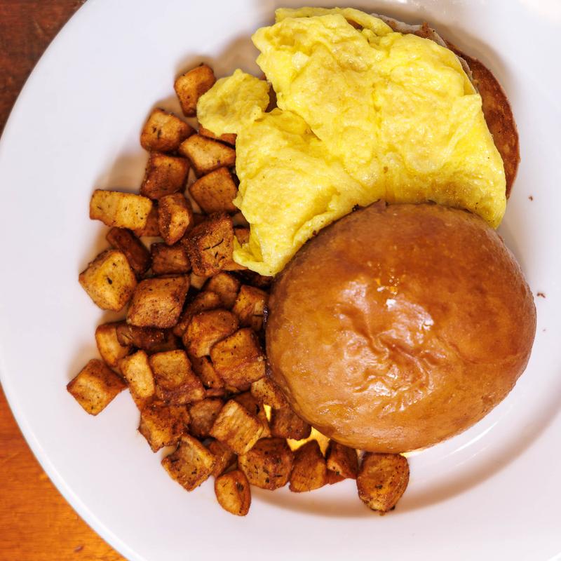 Scrambled egg with your choice of protein on a brioche bun,